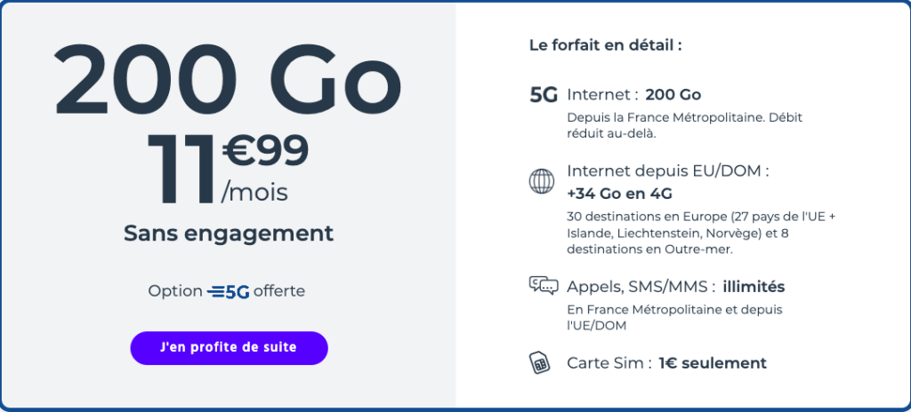 Besoin de beaucoup de data et d’une connexion ultra-rapide sans exploser votre budget ? Le forfait Cdiscount Mobile 200Go 5G à 11,99€/mois est fait pour vous ! Avec une enveloppe généreuse de 200Go d’internet en 5G, des appels illimités et aucun engagement, cette offre est idéale pour les utilisateurs exigeants qui veulent le meilleur sans se ruiner.