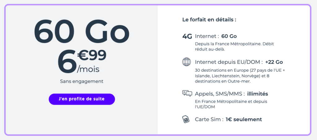 - 60Go d’internet mobile en 4G depuis la France métropolitaine. Idéal pour naviguer, regarder des vidéos et utiliser vos applications préférées sans contrainte.