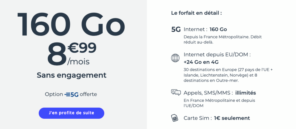 - 160 Go d’internet mobile en France (réseau Bouygues, 5G incluse)