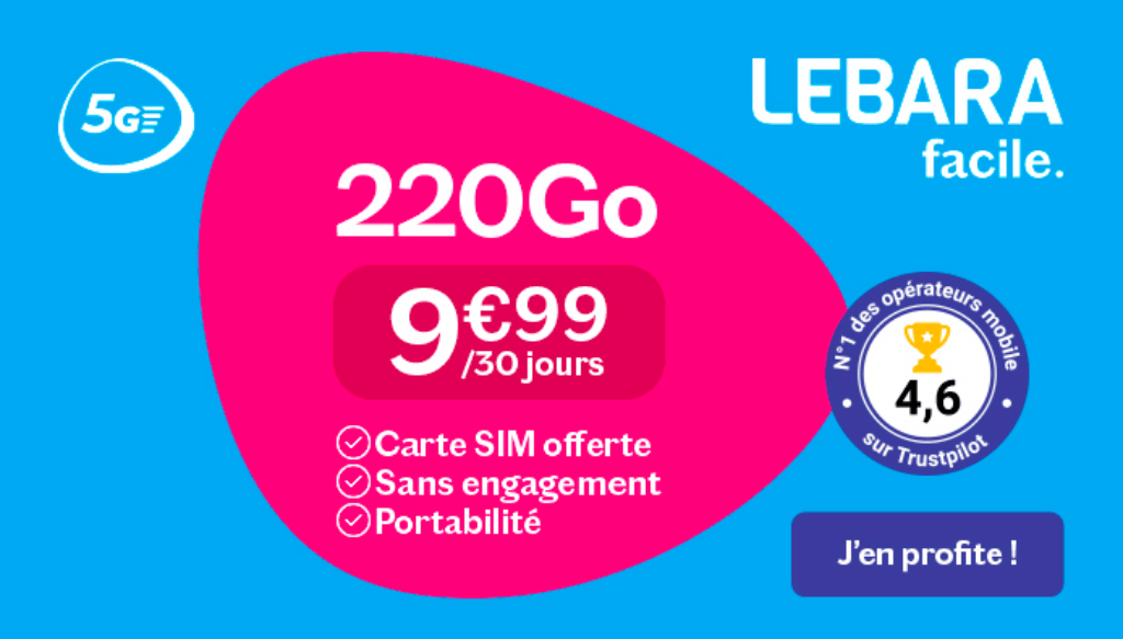 Ne ratez pas cette offre exceptionnelle de Lebara ! 220Go 5G pour seulement 9,99€/mois avec appels et SMS illimités en France. Et ce n’est pas tout : vous bénéficiez aussi de 7Go d’itinérance en Europe et DOM, le tout sur le réseau SFR. Une offre complète, à un tarif défiant toute concurrence !