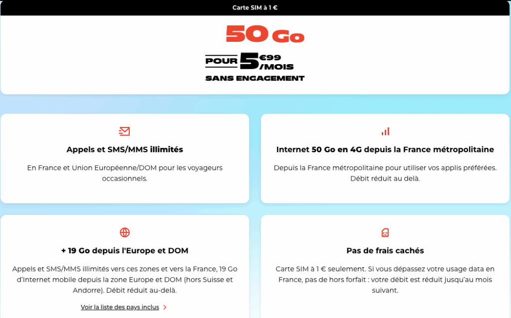 À 5,99€/mois, difficile de faire mieux pour 50 Go de data. Idéal pour les utilisateurs modérés à réguliers, ce forfait couvre largement les usages courants : navigation, réseaux sociaux, streaming occasionnel, etc.