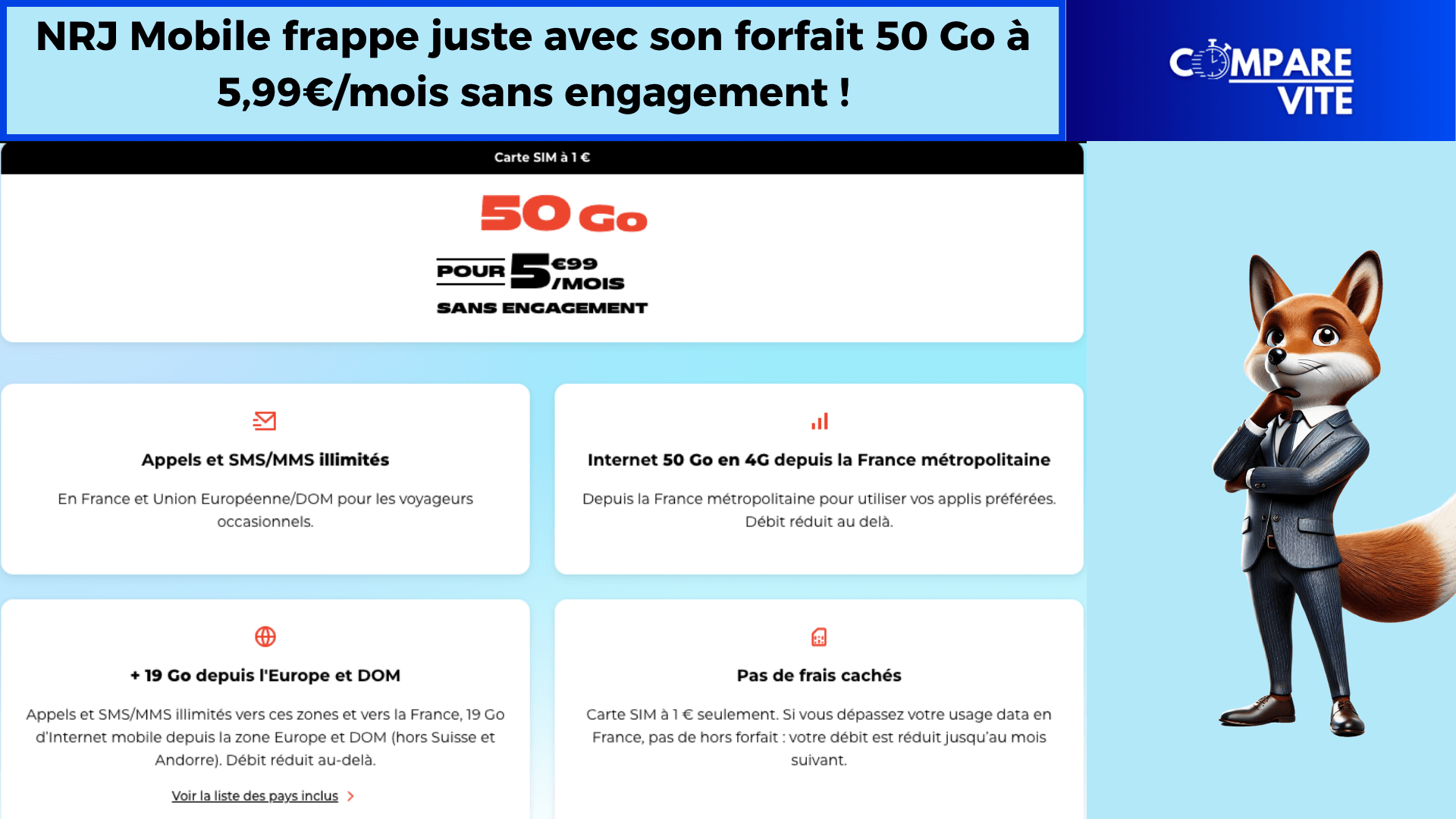 Sur Compare Vite, on sélectionne chaque mois les meilleurs forfaits mobile du moment selon vos critères : prix, data, réseau, options, etc. Ce NRJ Mobile 50 Go à 5,99€/mois coche toutes les cases si vous cherchez l’essentiel au meilleur prix.