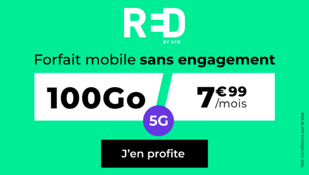 Vous ne rêvez pas, RED by SFR propose un forfait 100Go 5G pour seulement 7,99€/mois ! Avec cette offre sans engagement, vous bénéficiez d’une connexion ultra-rapide en 5G, d’appels et de SMS illimités, ainsi que de 26Go en Europe et DOM. Une opportunité à ne pas manquer !