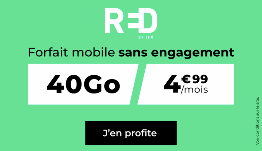 RED by SFR revient avec un excellent compromis pour les utilisateurs à la recherche d’un forfait mobile pas cher, complet et sans engagement. Son forfait 40 Go à 4,99€/mois en 4G inclut les appels et SMS/MMS illimités, ainsi qu’un roaming confortable avec 13 Go en Europe et DOM. Une offre simple, efficace et économique.