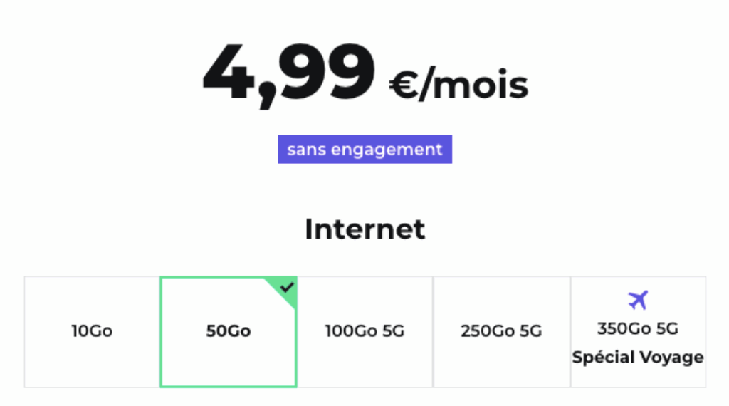 Proposé à seulement 4,99€/mois, ce forfait s’adresse à ceux qui veulent une bonne enveloppe internet mobile, des communications illimitées et aucune contrainte de durée. L’ajout de la 5G (+3€/mois) permet de booster le débit si besoin, tout en conservant un excellent rapport qualité/prix.