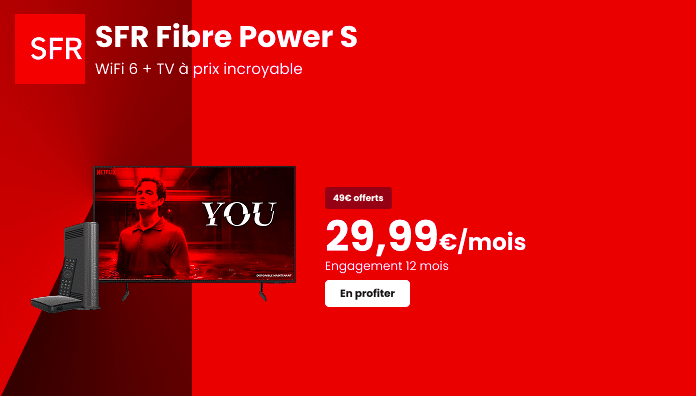 Besoin d’une offre internet complète avec une connexion rapide, une riche sélection de chaînes TV et un WiFi dernière génération ? Le forfait SFR Fibre Power S coche toutes les cases avec sa fibre jusqu’à 1 Gb/s, 160 chaînes incluses, et le WiFi 6, pour 29,99€/mois, engagement 12 mois.